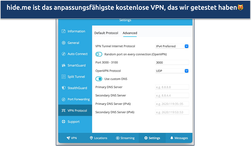 Mit hide.me kannst Du Deine Verbindung für PlayStation-Spiele umfangreich anpassen. Du kannst zwischen mehreren Protokollen wie WireGuard für mehr Geschwindigkeit oder OpenVPN für mehr Sicherheit wechseln. Außerdem kannst Du zwischen IPv4- und IPv6-Verbindungen wählen. Letztere können Deinen Ping senken, da sie NAT (Network Address Translation) umgehen und eine direktere Verbindung herstellen.