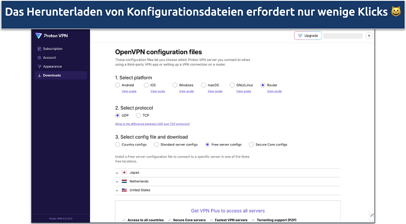 Unter den kostenlosen VPNs, die wir getestet haben, lässt sich Proton VPN am einfachsten auf einem Router einrichten. Dies macht es äußerst praktisch, um alle Geräte zu schützen, die mit Deinem Heimnetzwerk verbunden sind, einschließlich Deiner PlayStation. Sobald es eingerichtet ist, kannst Du Dich mit Servern in den USA, den Niederlanden und Japan verbinden. Während des Tests hatten wir es in weniger als 15 Minuten auf unserem Router eingerichtet und auch der Wechsel zwischen den Servern ist ganz einfach, da nur eine neue Konfigurationsdatei von Deinem Konto heruntergeladen werden muss.