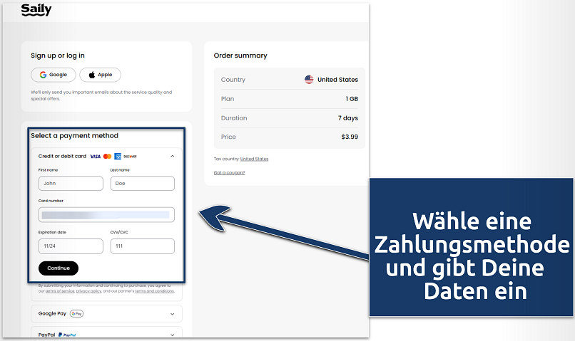 Melde Dich bei einem Anbieter an und zahle für Dein Paket. Für einige eSIMs ist keine Registrierung oder Angabe persönlicher Daten nötig. Die meisten akzeptieren viele Zahlungsmethoden, darunter Prepaid-Karten, Apple Pay, PayPal oder Kreditkarte.