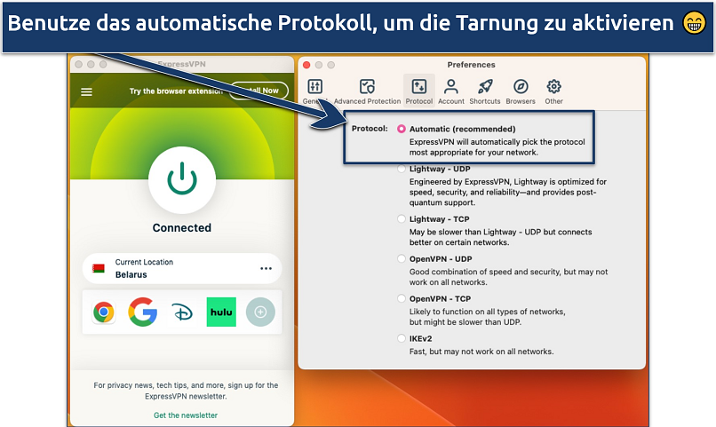 ExpressVPN bietet auf jedem Server Tarnung, inklusive auf denen in Deutschland, Österreich und der Schweiz. Damit funktioniert das VPN effektiv in Russland. Erkennt es Einschränkungen, tarnt es den VPN-Datenverkehr automatisch als normalen Web-Datenverkehr. Dann ist er weniger verdächtig. Das verhindert die Erkennung durch lokale ISPs und Behörden, die VPN-Verbindungen aktiv blockieren. Somit kannst Du von überall aus geschützt auf die Inhalte zugreifen, die Du benötigst.