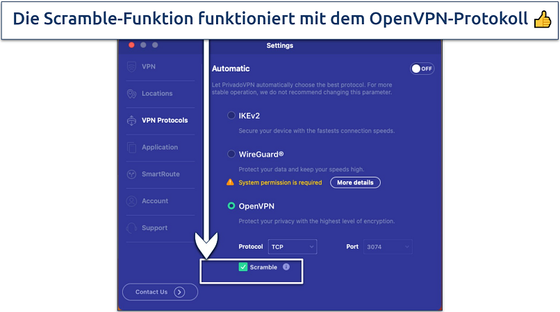 PrivadoVPNs Funktion Scramble (Verschleierung) ist benutzerfreundlich und tarnt Deinen VPN-Datenverkehr. Sie ist für Windows, macOS, Android und iOS verfügbar. Ich habe die Funktion ganz einfach in der App gefunden und aktiviert. Somit kannst Du Deine Online-Aktivitäten ganz einfach privat in (und außerhalb von) Russland genießen.