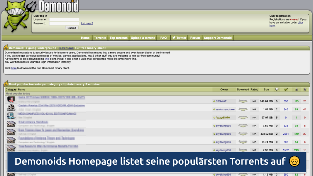Auf Demonoid kannst Du keine Torrent-Dateien mehr ohne ein Konto herunterladen. Auf der Homepage steht außerdem, dass Du einen VPN-Client installieren musst, um auf Inhalte zugreifen zu können.