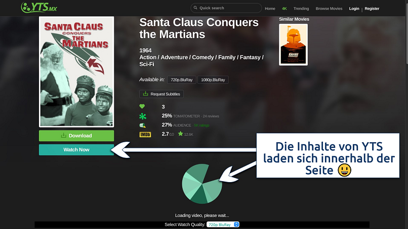 Da sich YTS auf Filme spezialisiert hat, wirst Du keine anderen Inhalte wie Musik, Spiele oder Software finden, die in Deiner Suche stören könnten. Zudem bekommst Du die Nutzerdaten von IMDb und RottenTomatoes. Du siehst also bereits vor einem Download, ob Dir ein Film gefallen könnte.
