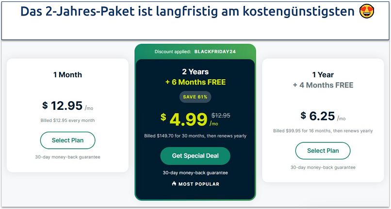 - 2-Jahres-Paket (plus 6 Monate extra): 149,70 $ Vorkasse, durchschnittlich 4,99 $ pro Monat für 30 Monate. Das Paket mit dem besten Preis-Leistungs-Verhältnis für langfristige Abonnenten.