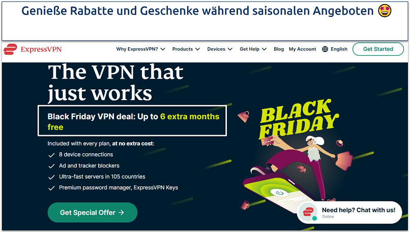 Halte während großer Veranstaltungen wie Black Friday, Cyber Monday und Ostern nach Sonderangeboten Ausschau. Zu diesen Zeiten bietet ExpressVPN Rabatte und Bonusmonate auf Jahrespakete, sodass Du noch mehr gegenüber dem regulären Preis sparen kannst.